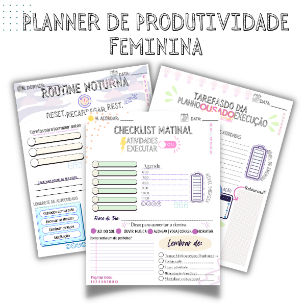 O segredo para uma vida produtiva e com propósito está em suas mãos. Conheça o nosso incrível Planner de Produtividade Feminina, a ferramenta perfeita para mulheres que desejam realizar 100 vezes mais em menos tempo. Com ele, você conquistará a eficiência máxima, transformando cada dia em uma jornada repleta de realizações e equilíbrio. Liberte-se do caos da rotina e descubra como conquistar seus sonhos, aproveitando cada instante com foco, organização e empoderamento. Prepare-se para viver uma vida extraordinária